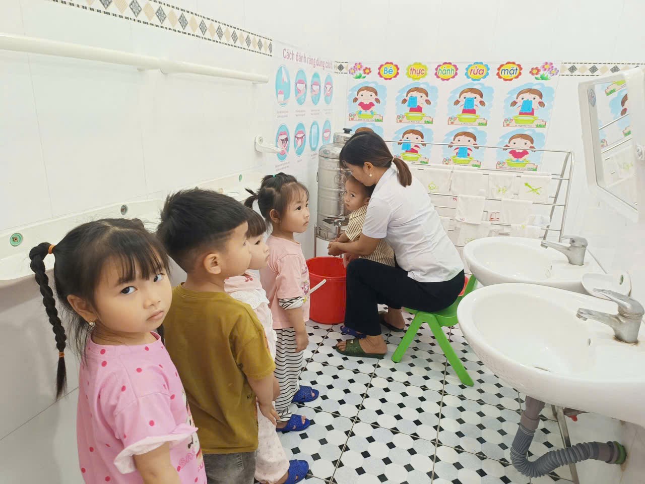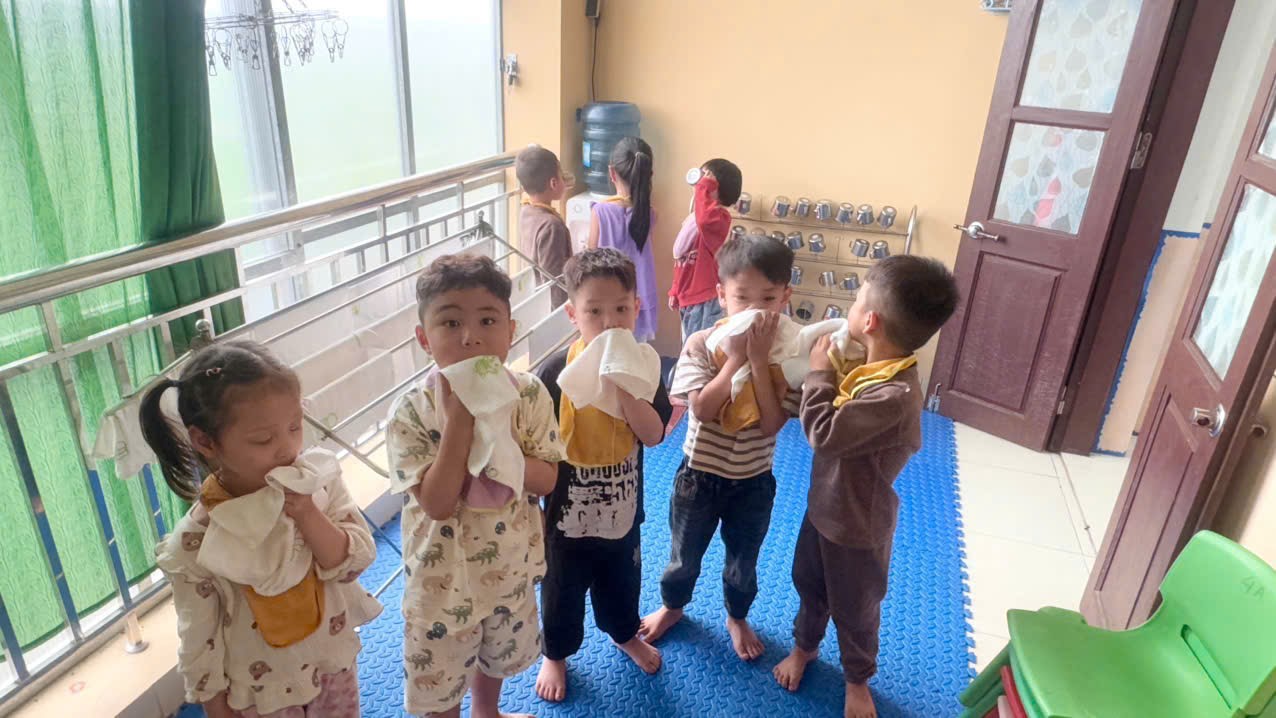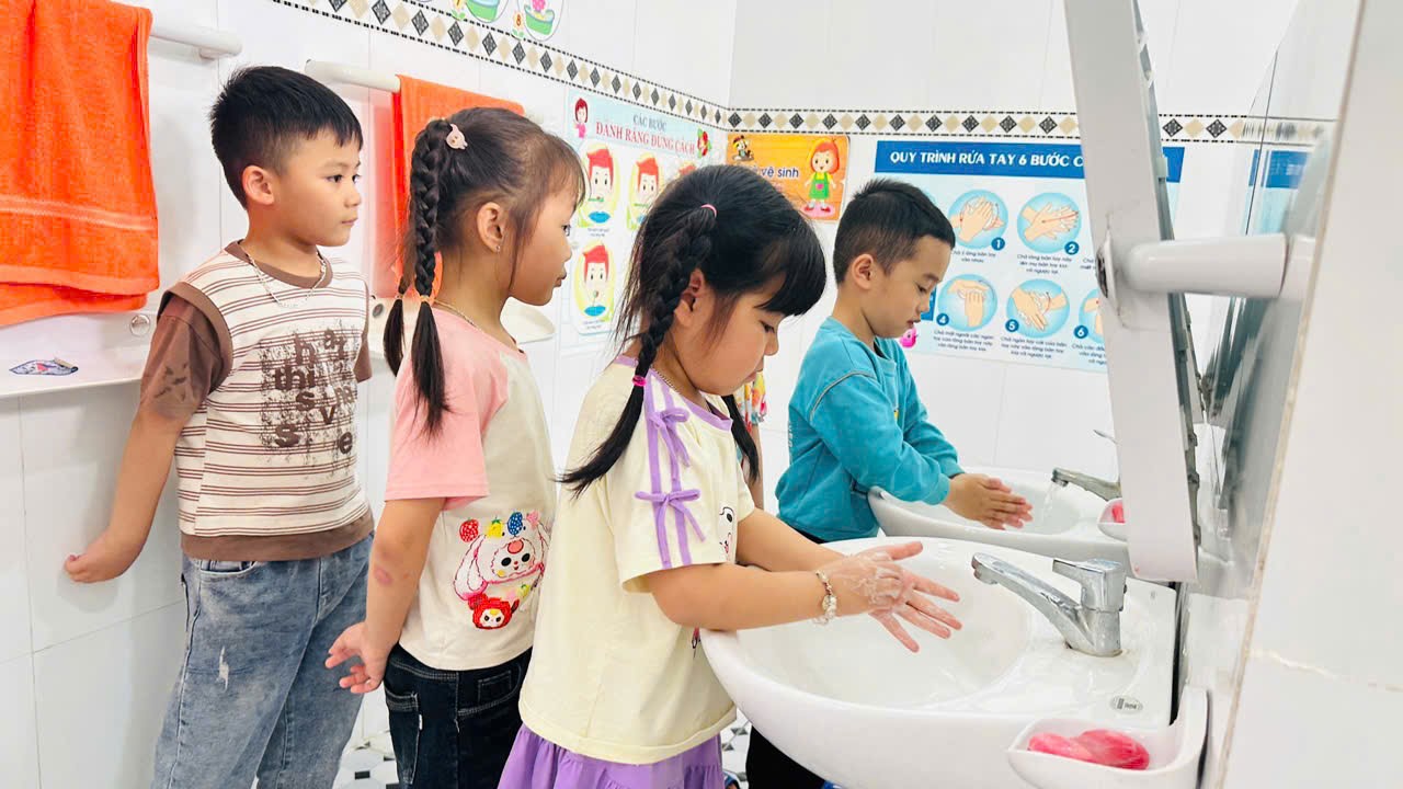 Bên cạnh đó, công tác chăm sóc vệ sinh cá nhân cho trẻ cũng được nhà trường chú trọng. Trẻ được hướng dẫn và rèn luyện thói quen rửa tay sạch sẽ trước khi ăn và sau khi đi vệ sinh, lau mặt hàng ngày, giữ gìn cơ thể sạch sẽ. Giáo viên luôn theo sát, nhắc nhở và hỗ trợ để hình thành cho trẻ những thói quen tốt ngay từ nhỏ.