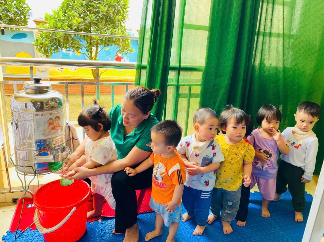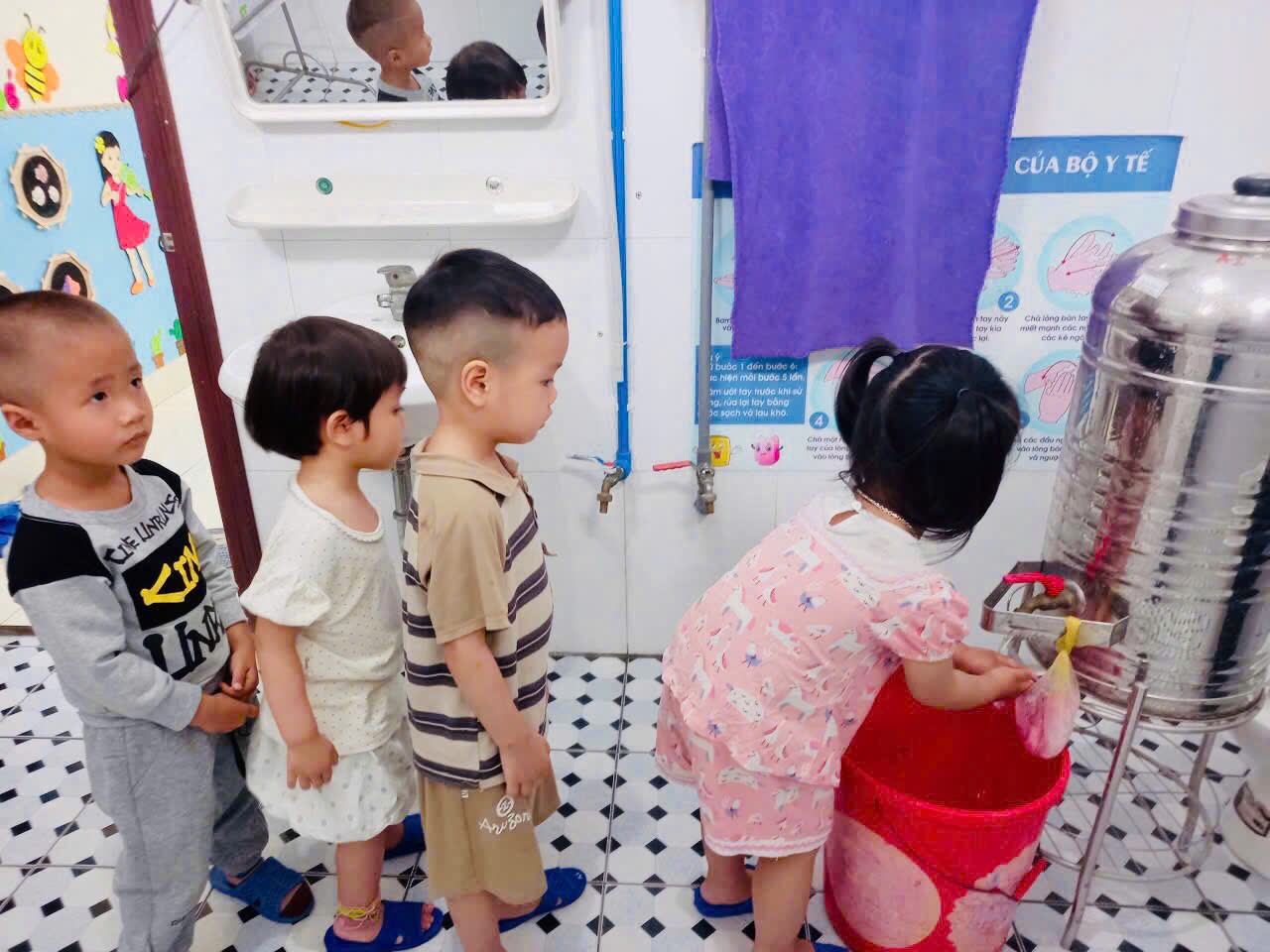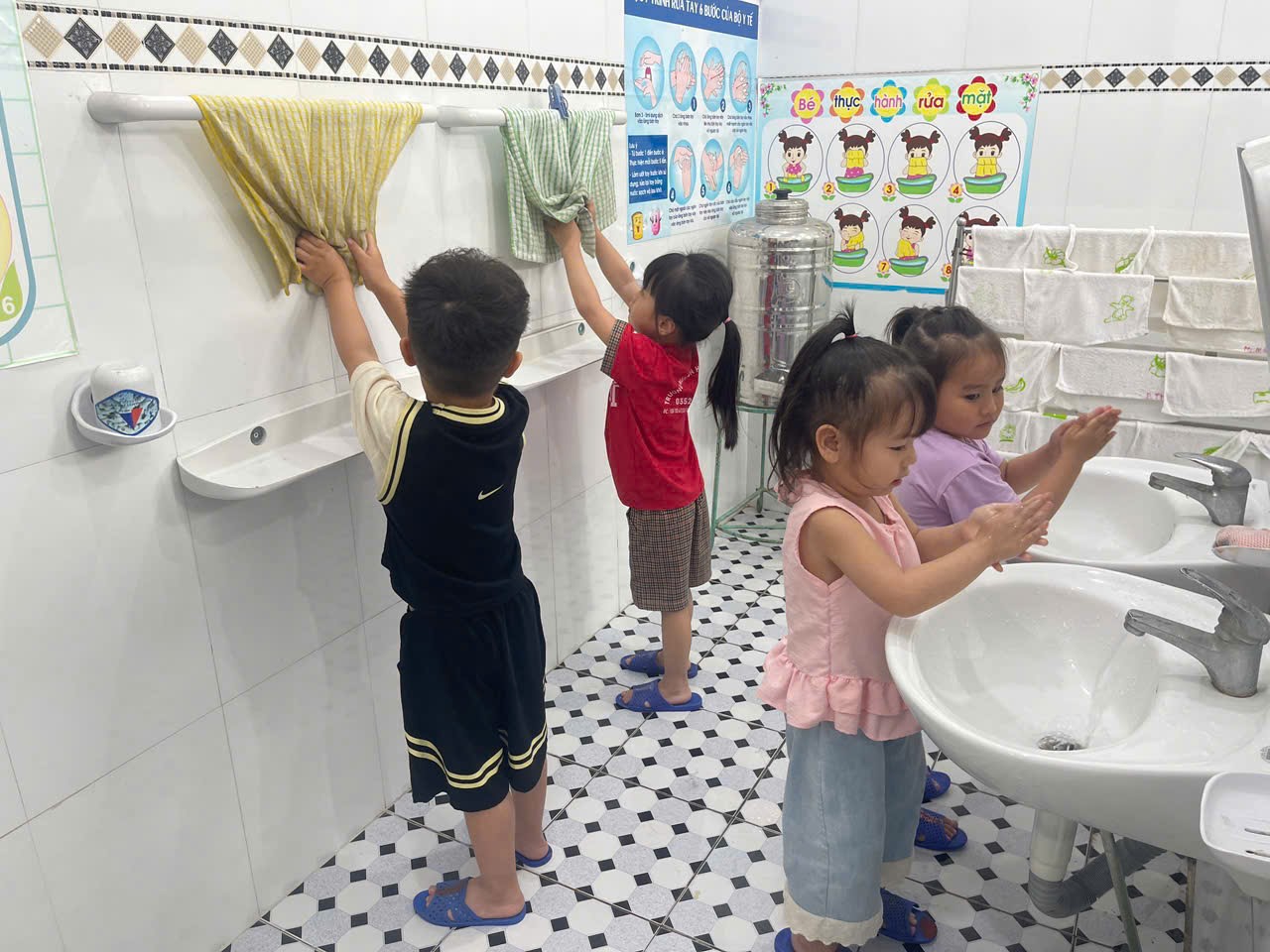 Bên cạnh đó, công tác chăm sóc vệ sinh cá nhân cho trẻ cũng được nhà trường chú trọng. Trẻ được hướng dẫn và rèn luyện thói quen rửa tay sạch sẽ trước khi ăn và sau khi đi vệ sinh, lau mặt hàng ngày, giữ gìn cơ thể sạch sẽ. Giáo viên luôn theo sát, nhắc nhở và hỗ trợ để hình thành cho trẻ những thói quen tốt ngay từ nhỏ.