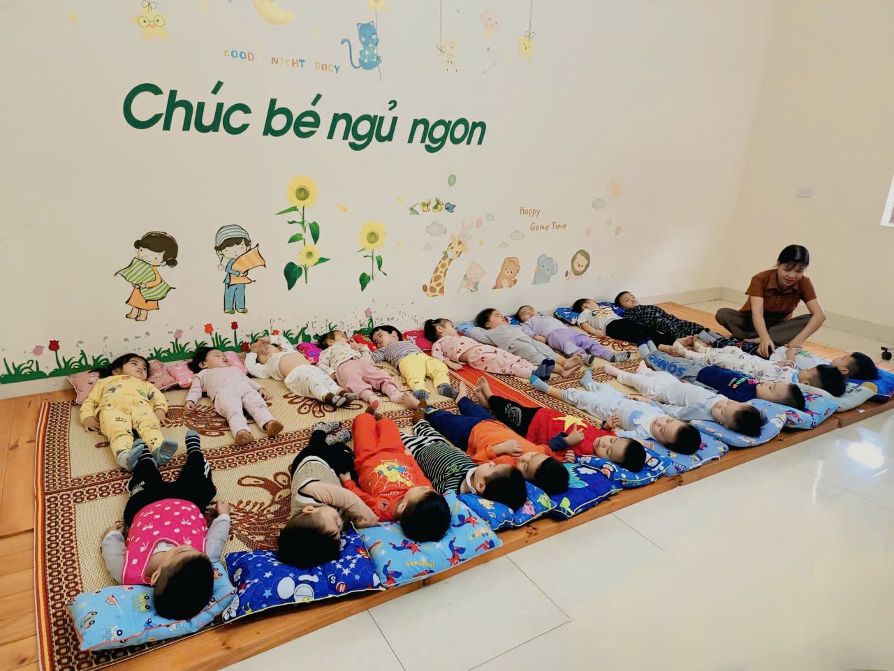 Ngoài ra, chế độ ngủ nghỉ của trẻ cũng được thực hiện nghiêm túc. Trẻ được ngủ đúng giờ, trong môi trường yên tĩnh, thoáng, đảm bảo sức khỏe và sự phát triển toàn diện. Giáo viên luôn quan tâm, theo dõi giấc ngủ của trẻ để kịp thời kịp thời điều chỉnh khi cần thiết.