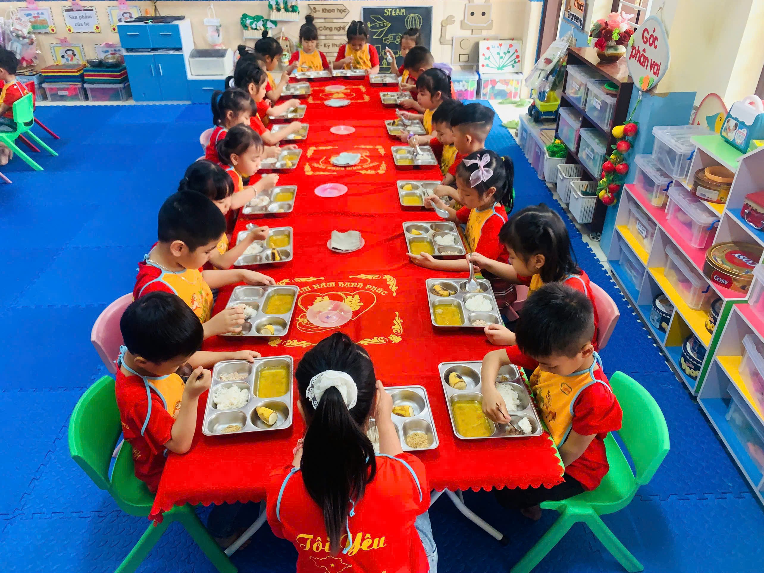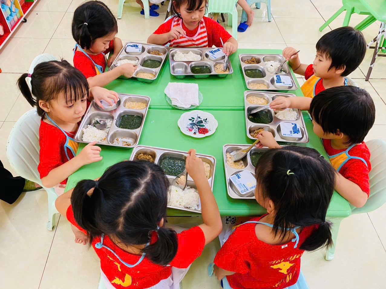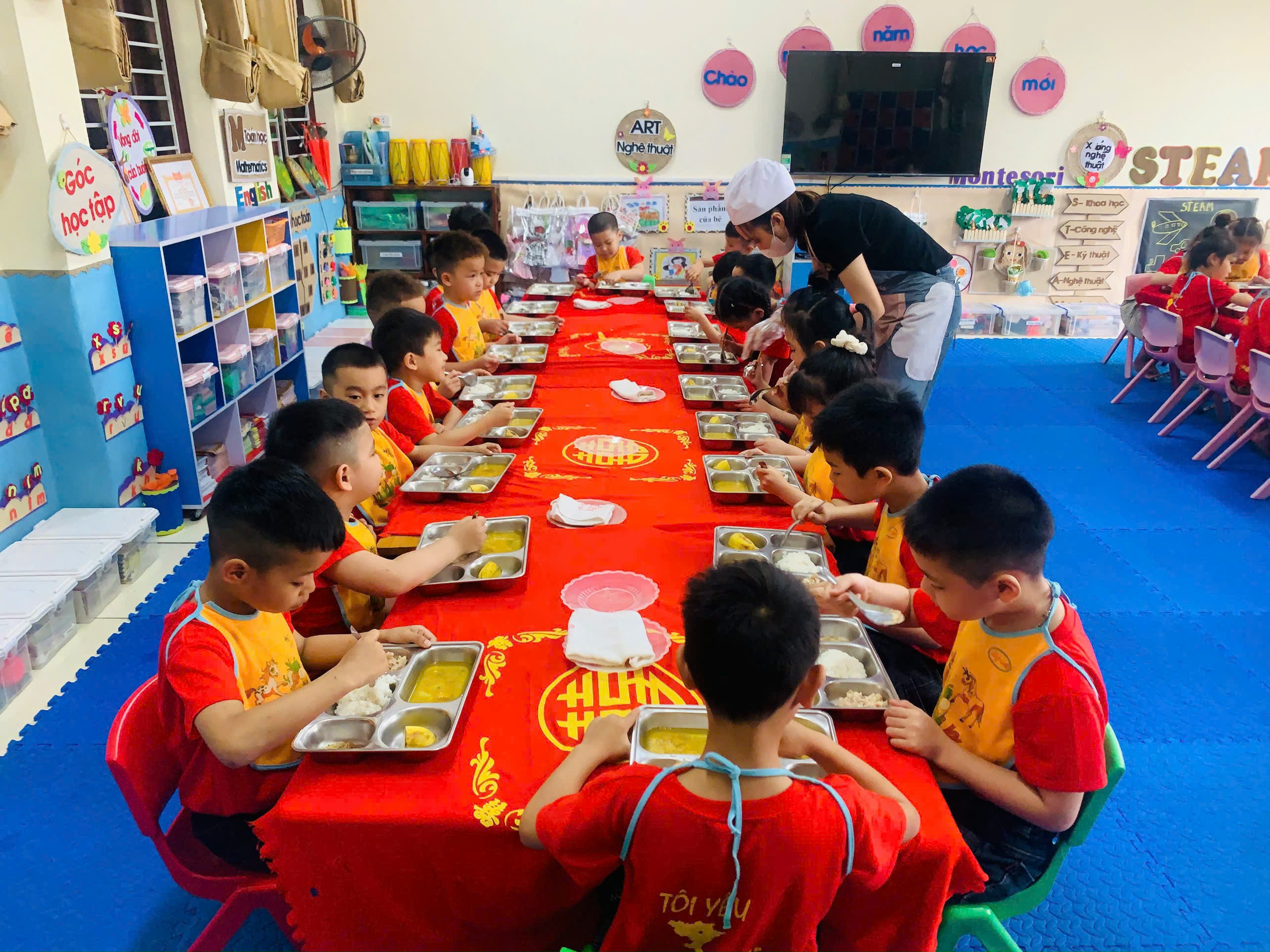 Giáo viên trên nhóm lớp tổ chức các bữa ăn khoa học, hợp lý về thời gian và khẩu phần ăn. Trẻ được ăn đúng giờ, đủ bữa, đảm bảo cân đối các nhóm chất dinh dưỡng. Không chỉ vậy, trẻ còn được hướng dẫn cách ăn uống văn minh, tự lập trong bữa ăn.