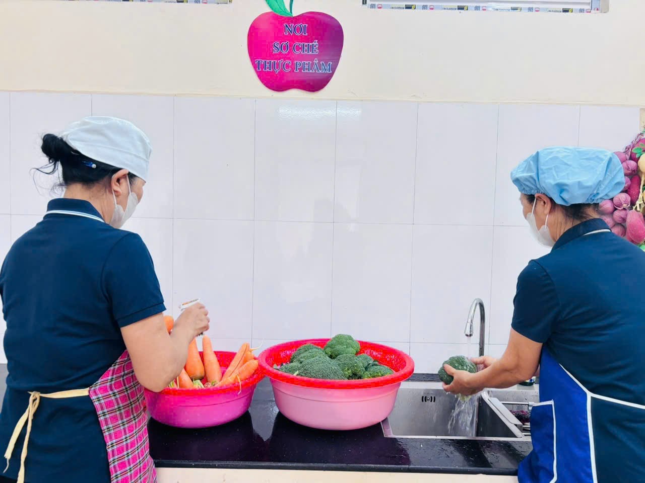 Trước hết, nhà trường đặc biệt quan tâm đến khâu lựa chọn và tiếp nhận thực phẩm. Thực phẩm được nhập vào luôn đảm bảo tươi, ngon, sạch, có nguồn gốc rõ ràng và được kiểm tra kỹ lưỡng trước khi đưa vào chế biến. Đây là yếu tố quan trọng nhằm đảm bảo an toàn vệ sinh thực phẩm, phòng tránh các nguy cơ gây hại đến sức khỏe của trẻ.