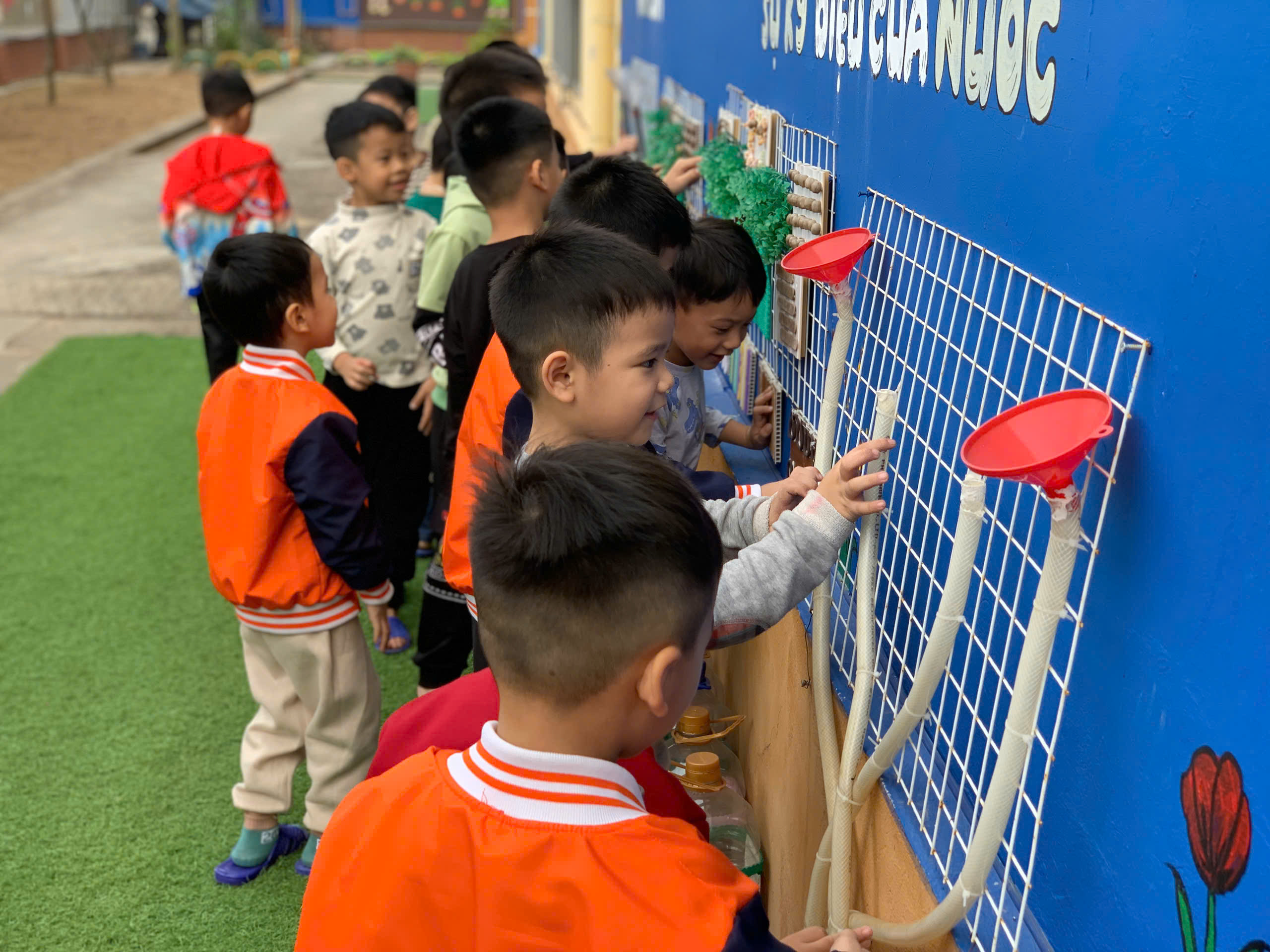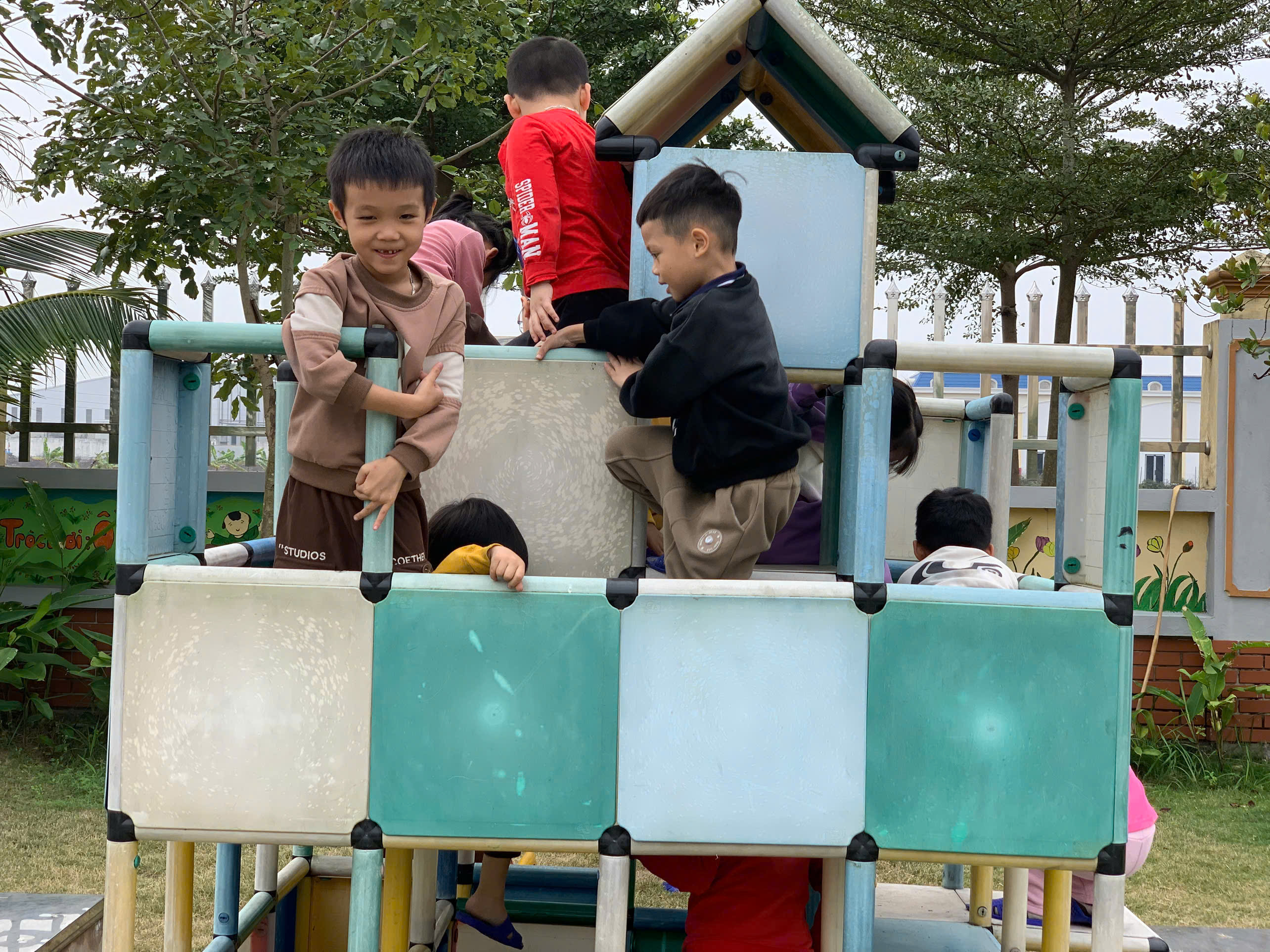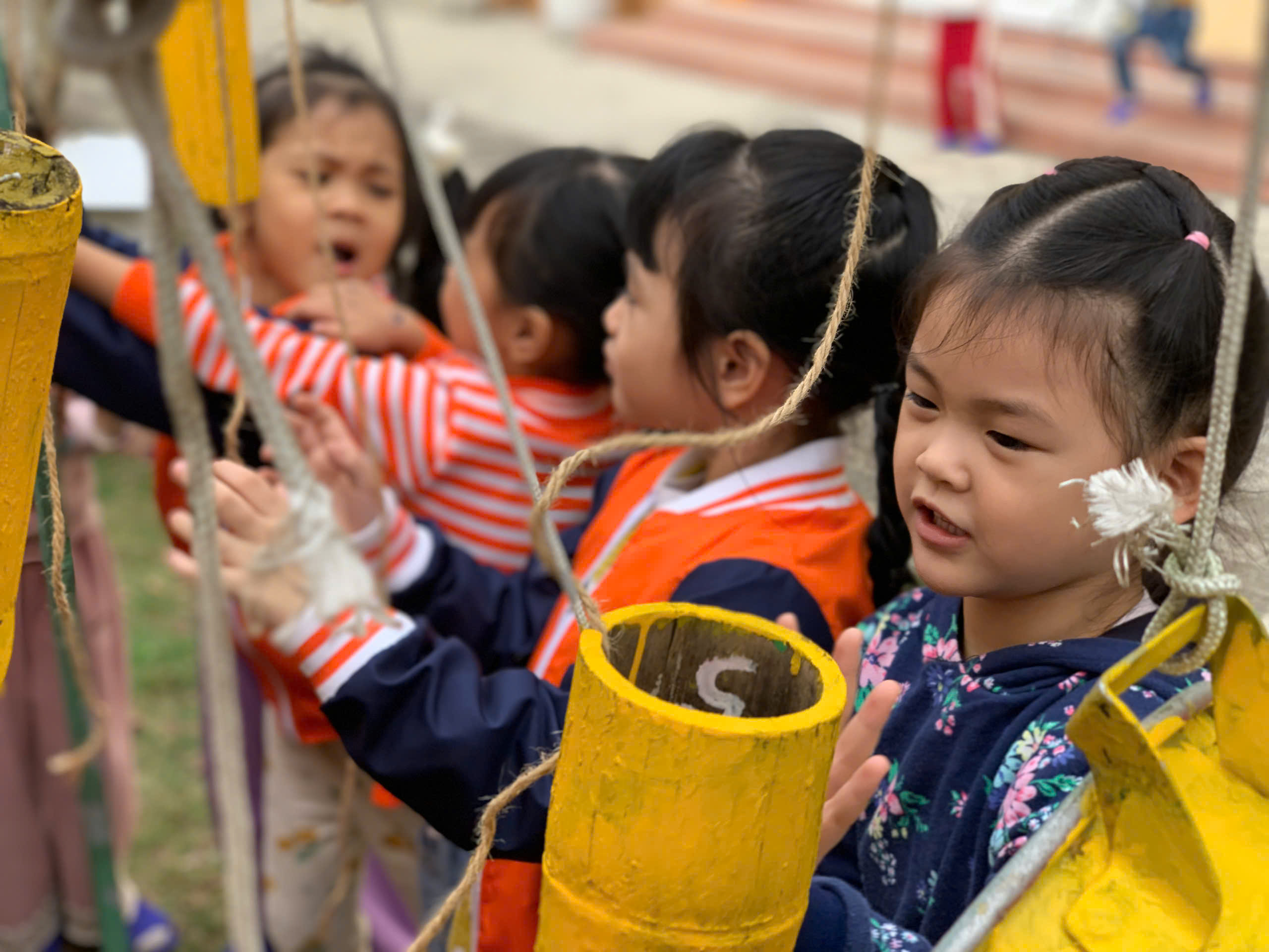 Ngoài các giờ học chính khóa, nhà trường còn khuyến khích trẻ tham gia vận động trong giờ chơi ngoài trời. Trẻ được chạy nhảy trên sân trường, chơi cầu trượt, xích đu, bập bênh, hoặc tham gia các trò chơi tập thể như kéo co, nhảy bao bố, mèo đuổi chuột. Những hoạt động này giúp trẻ giải tỏa năng lượng, tăng khả năng giao tiếp, học cách hợp tác với bạn bè và phát triển tinh thần đoàn kết.