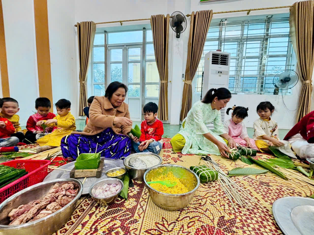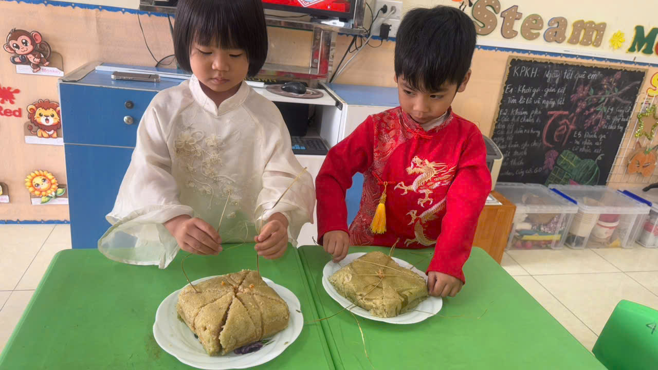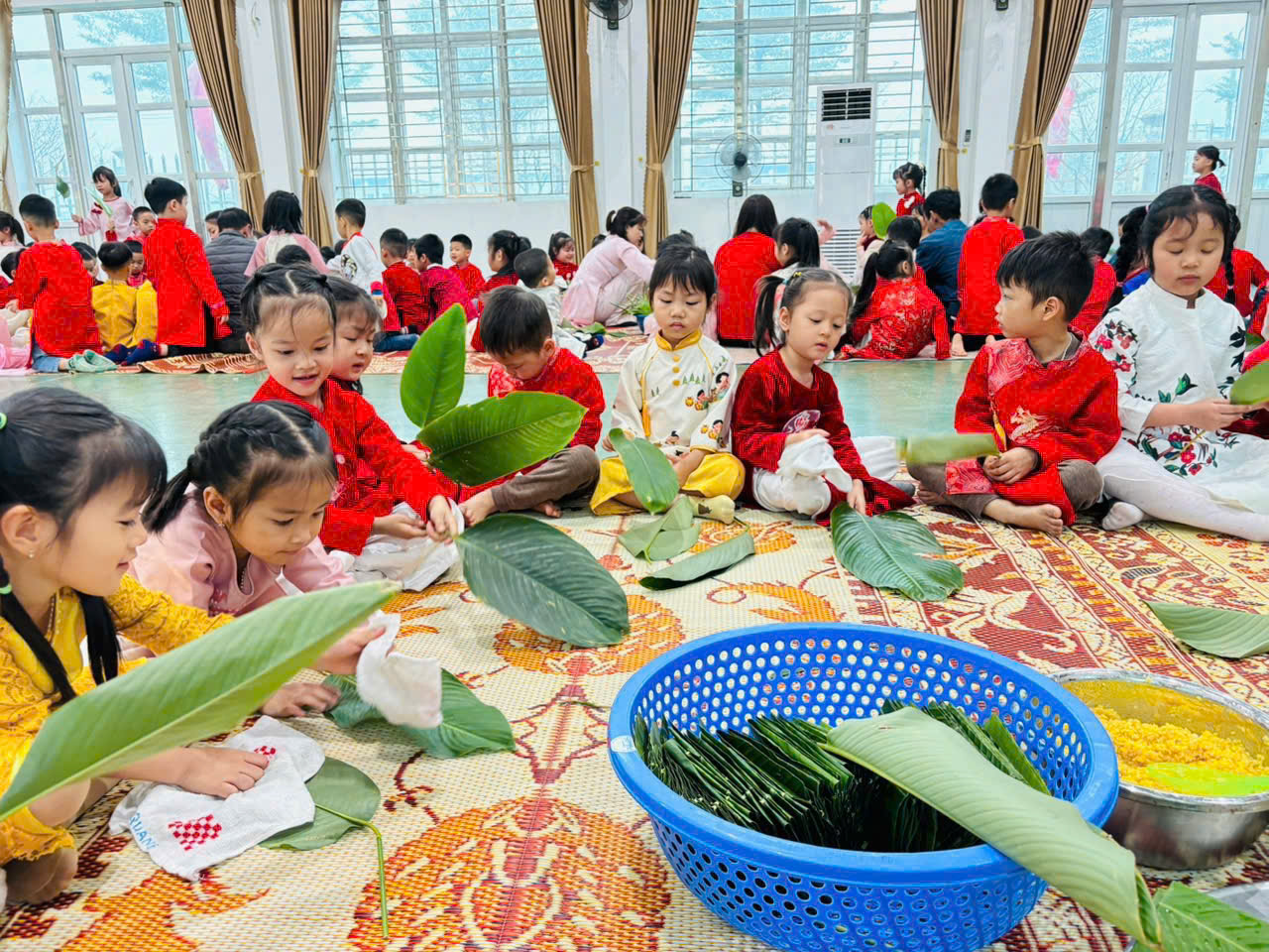 Đặc biệt, hoạt động trải nghiệm gói bánh chưng đã để lại nhiều ấn tượng sâu sắc cho các con. Dưới sự hướng dẫn của giáo viên và nhà trường, trẻ được làm quen với lá dong, gạo nếp, đỗ xanh, thịt lợn và tìm hiểu ý nghĩa của chiếc bánh chưng ngày Tết. Qua đó, các con thêm yêu nét đẹp văn hóa truyền thống của dân tộc.