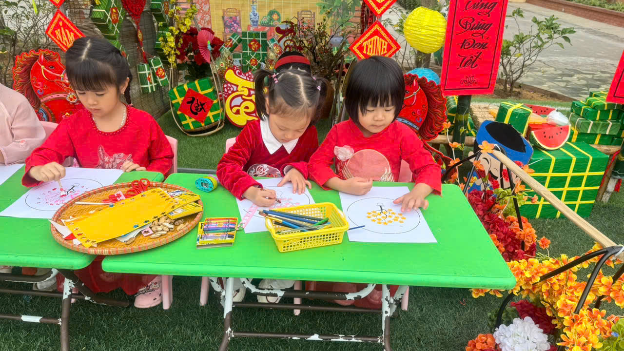 Mở đầu cho các hoạt động là trải nghiệm vẽ, tô màu tranh Tết. Qua những bức tranh về hoa mai, hoa đào, bánh chưng, bánh tét, các con được thỏa sức sáng tạo, rèn luyện sự khéo léo của đôi tay và cảm nhận không khí Tết đang đến gần. Mỗi sản phẩm đều thể hiện niềm vui, sự hồn nhiên và trí tưởng tượng phong phú của trẻ.