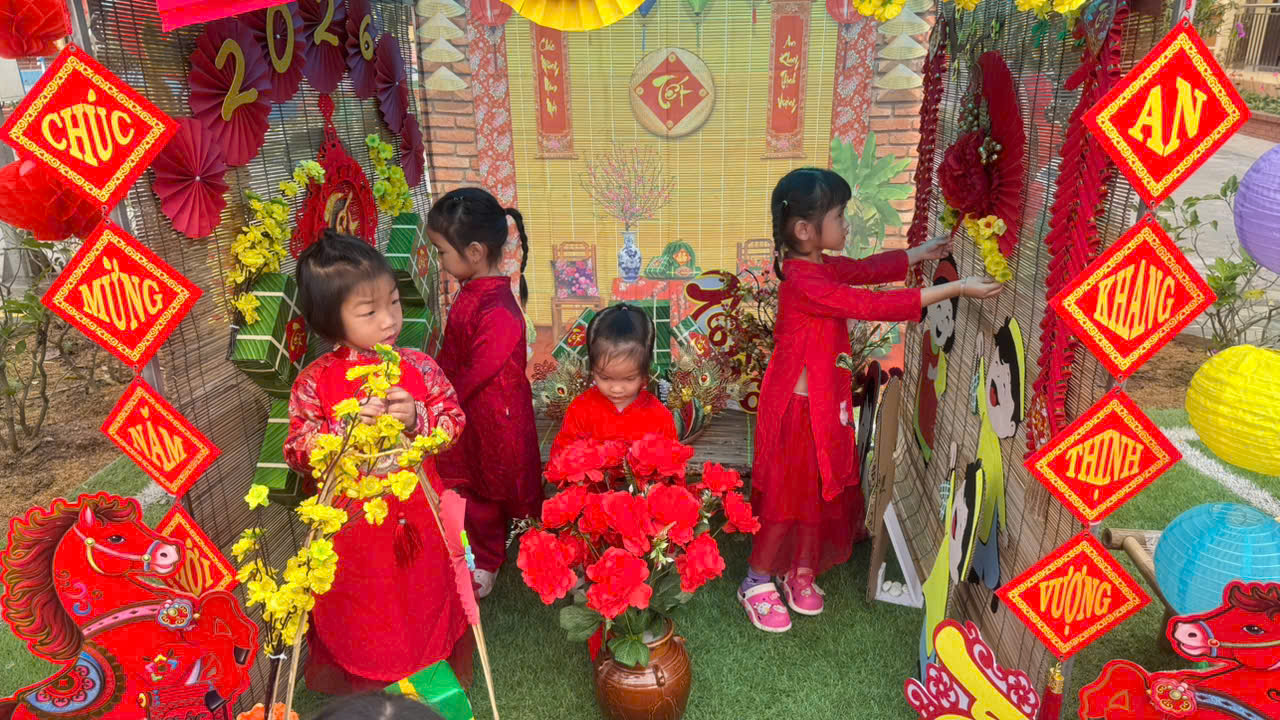 Bên cạnh đó, hoạt động chụp ảnh Tết trong không gian trang trí mang đậm sắc xuân đã mang lại cho các con những khoảnh khắc đáng yêu và đáng nhớ. Trong những bộ trang phục truyền thống, các bé tự tin tạo dáng, nở nụ cười rạng rỡ, góp phần lưu giữ những hình ảnh đẹp của tuổi thơ bên thầy cô và bạn bè.