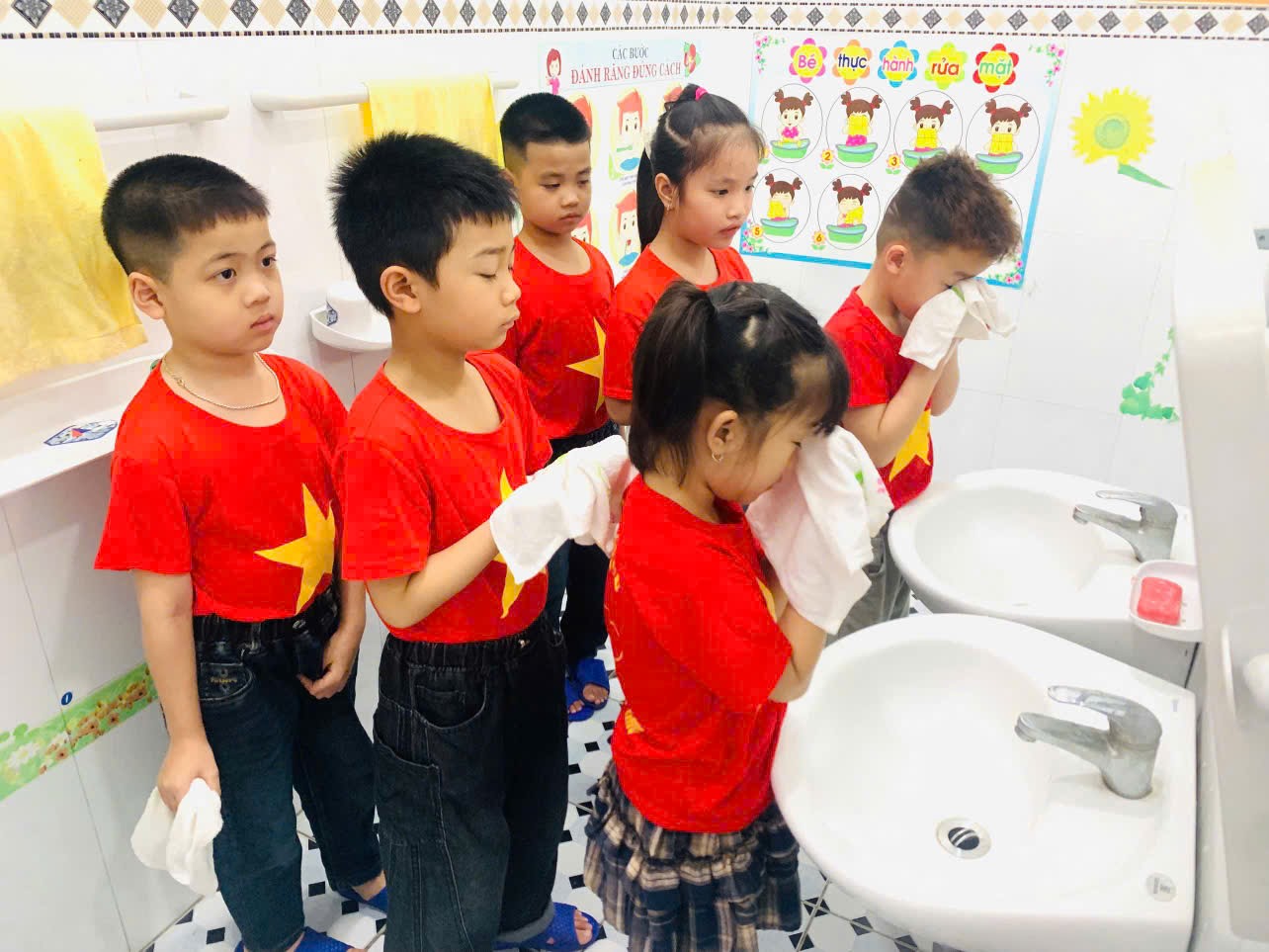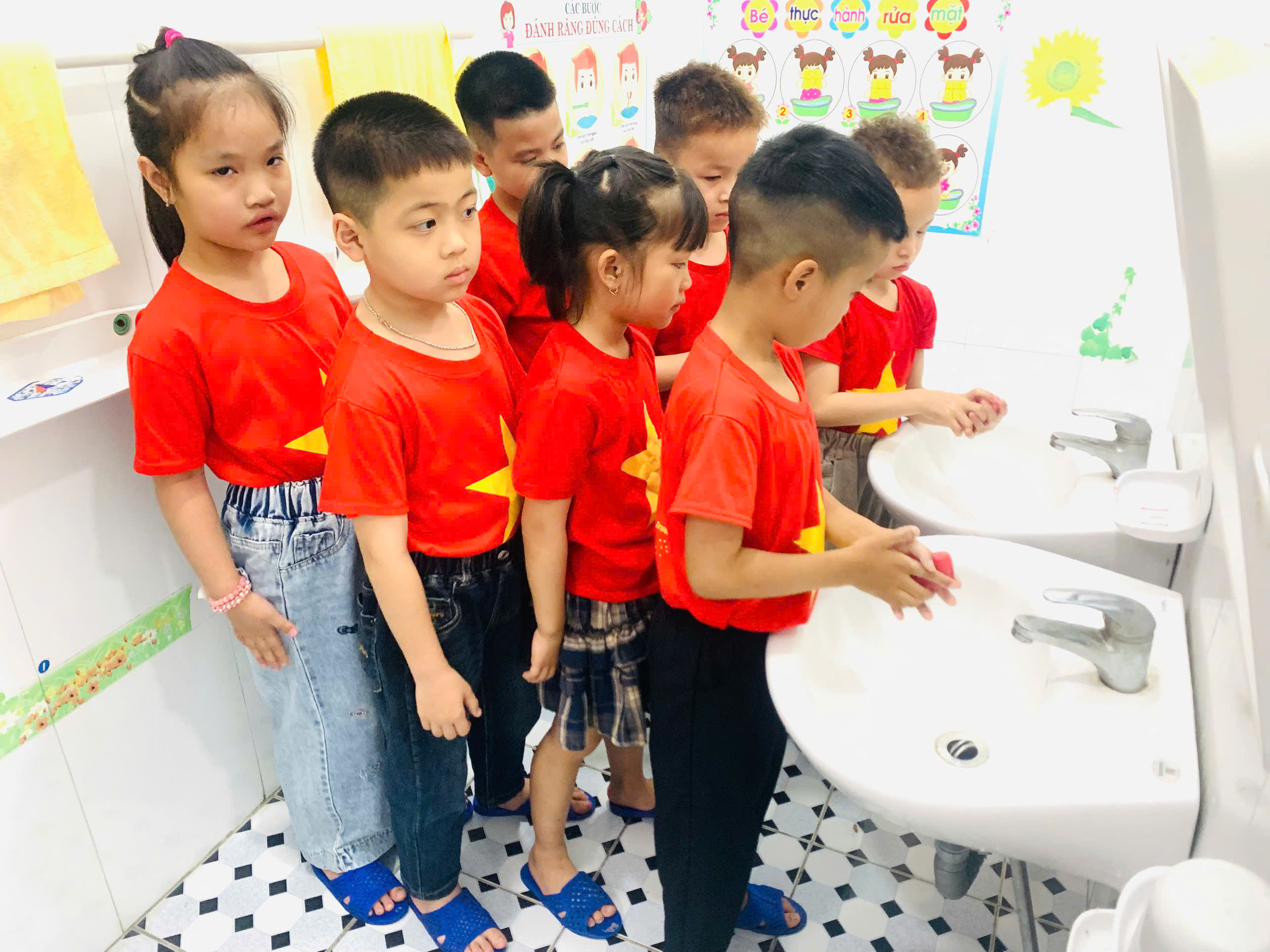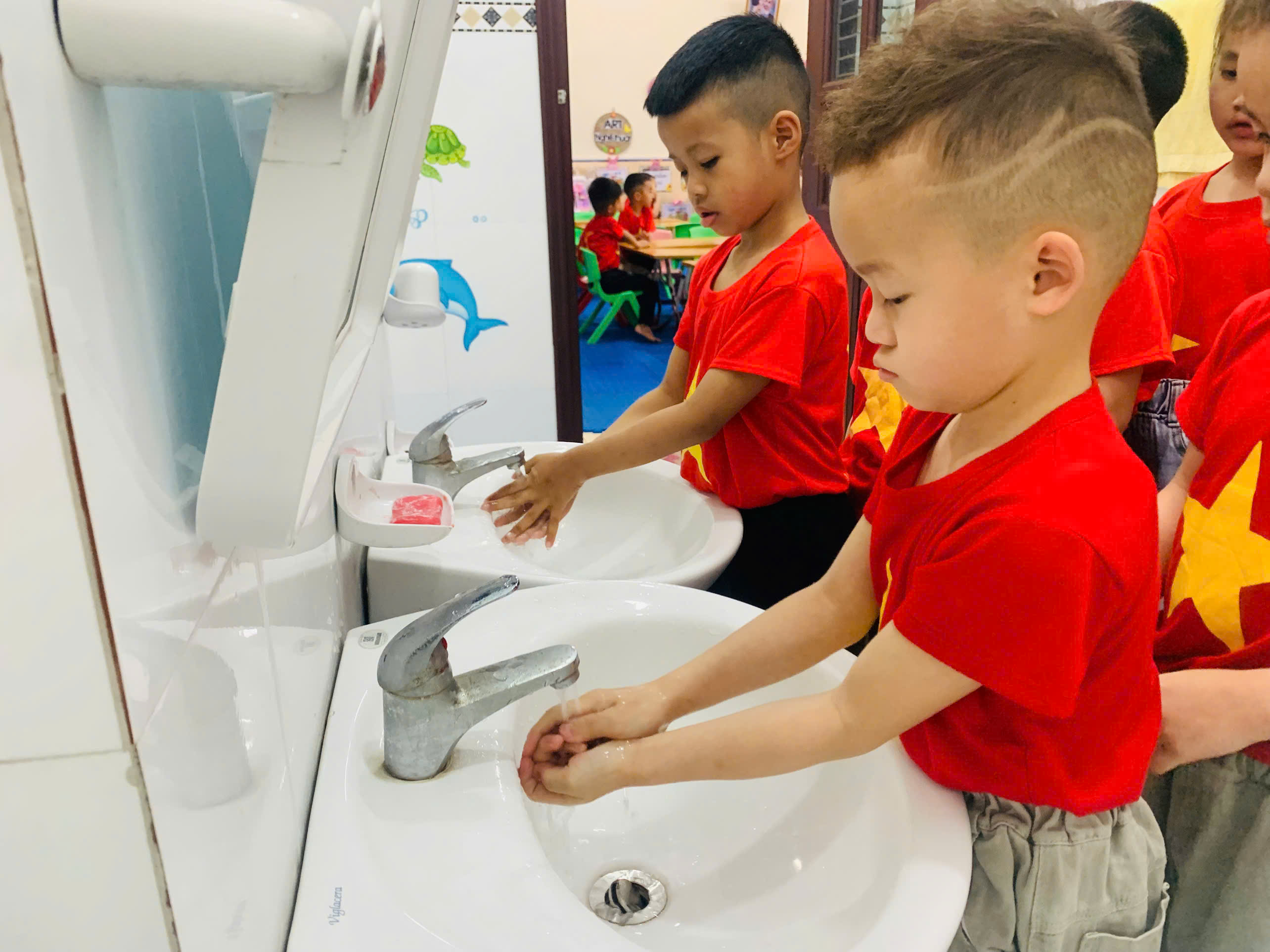 – Tại trường mầm non, giáo viên cần hướng dẫn trẻ thực hiện vệ sinh cá nhân đúng cách, đặc biệt là rửa tay bằng xà phòng dưới vòi nước sạch trước khi ăn và sau khi đi vệ sinh.