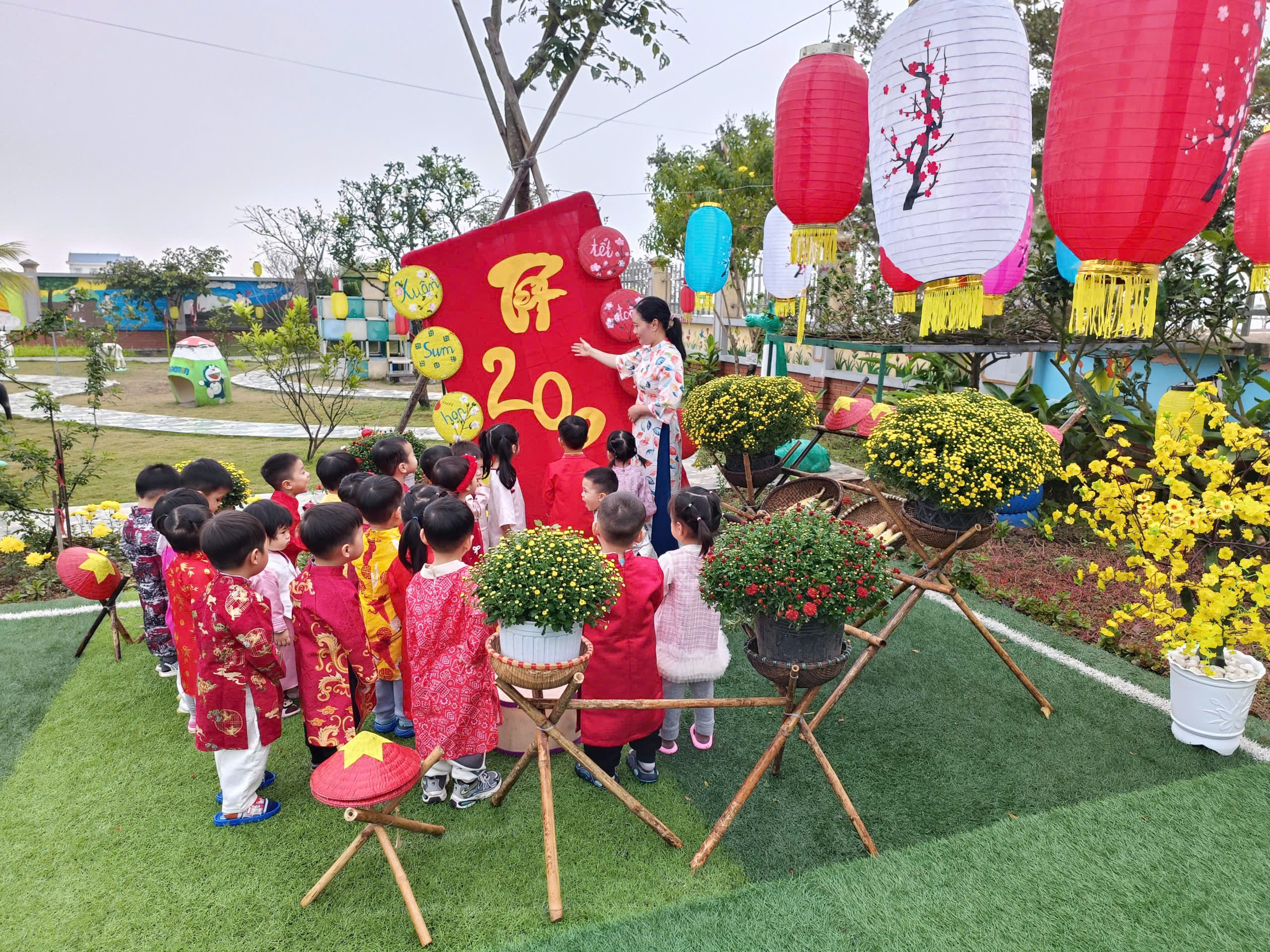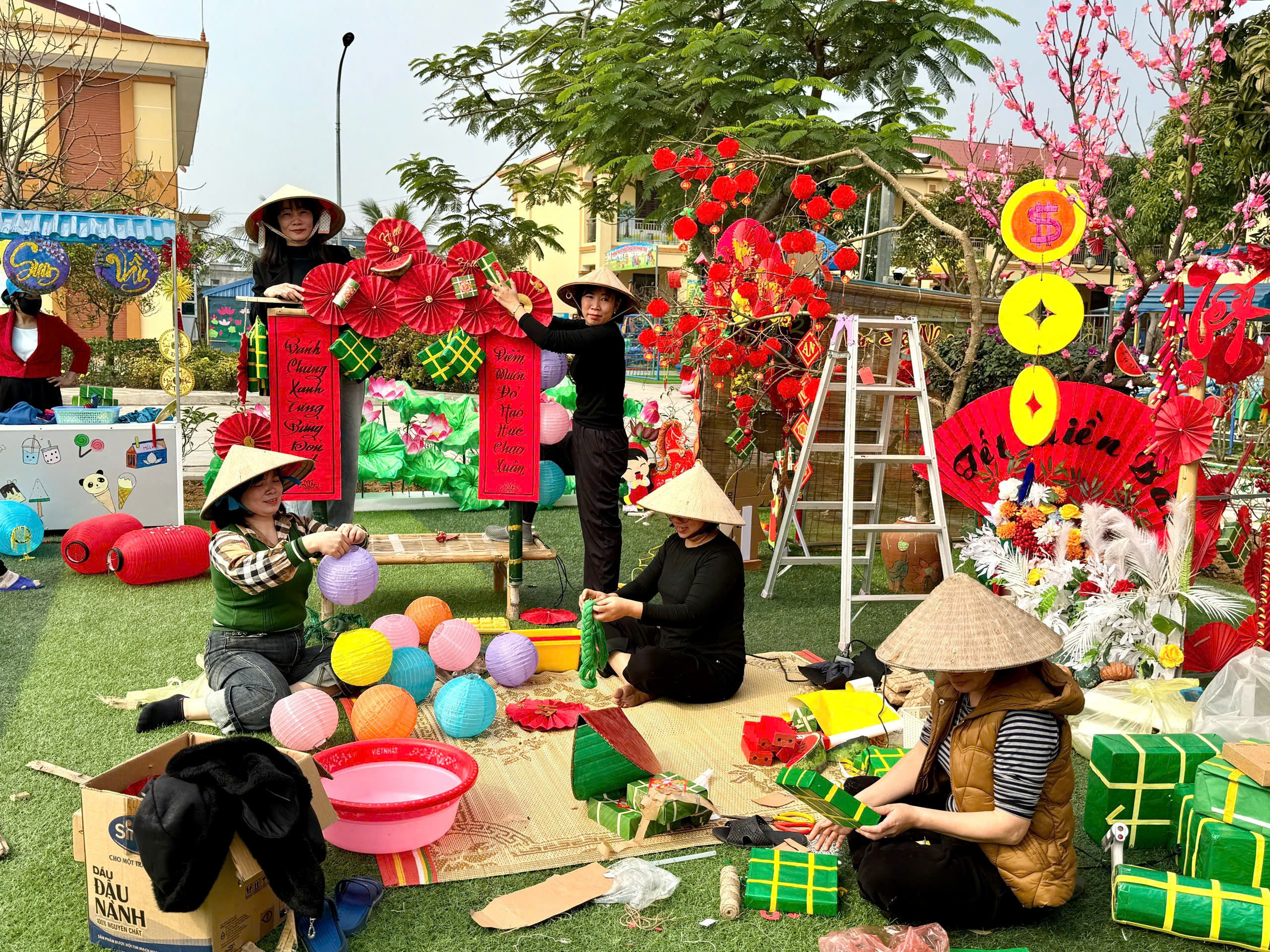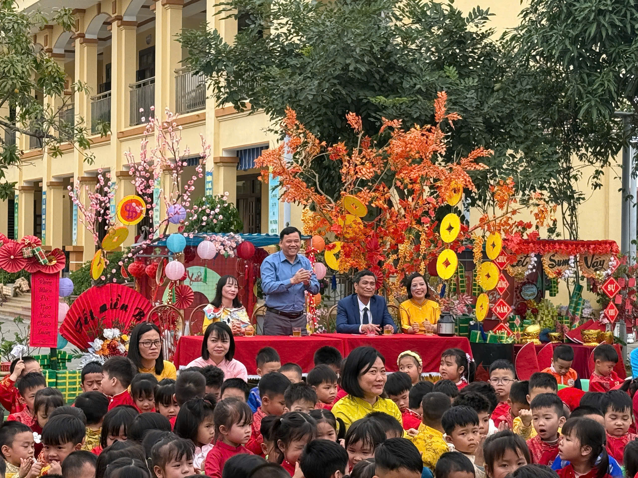 Nhà trường trang trí lớp học và sân trường rực rỡ sắc xuân với hoa đào, hoa mai, cây quất, đèn lồng, câu đối đỏ. Không gian học tập được khoác lên “chiếc áo mới”, tạo cảm giác ấm áp, thân quen, giúp trẻ hào hứng và yêu thích đến trường hơn trong những ngày giáp Tết.