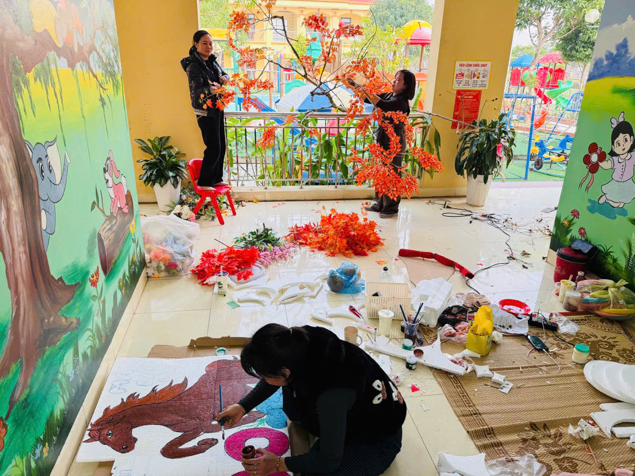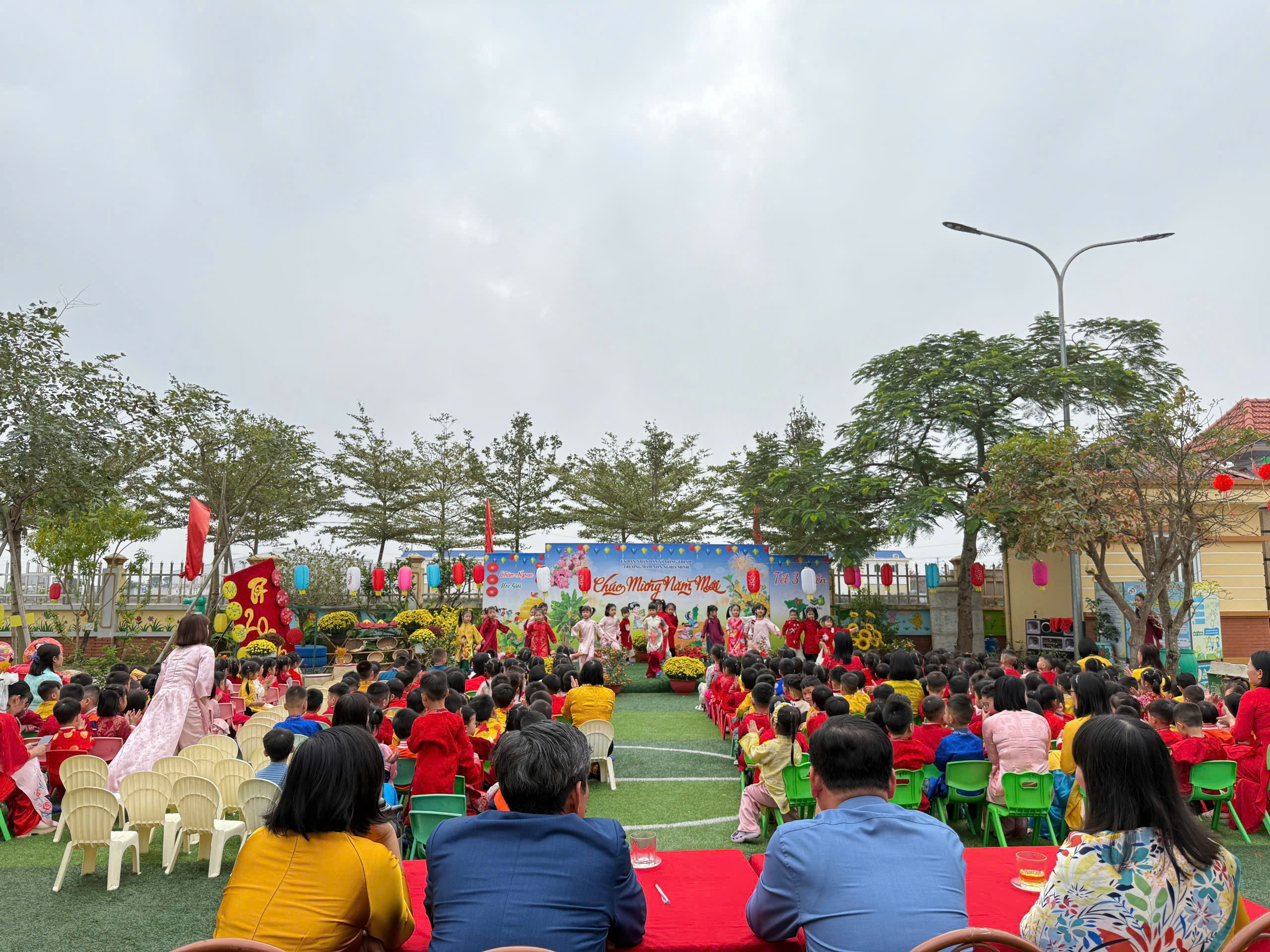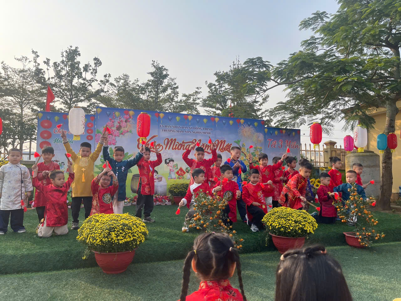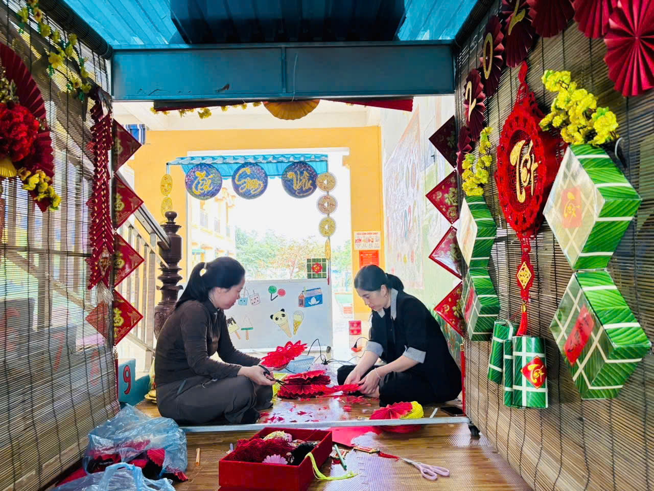 Nhà trường trang trí lớp học và sân trường rực rỡ sắc xuân với hoa đào, hoa mai, cây quất, đèn lồng, câu đối đỏ. Không gian học tập được khoác lên “chiếc áo mới”, tạo cảm giác ấm áp, thân quen, giúp trẻ hào hứng và yêu thích đến trường hơn trong những ngày giáp Tết.